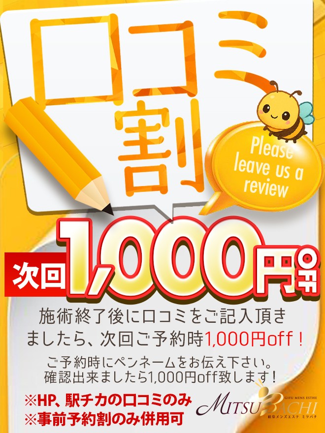 施術終了後の口コミ投稿で、 次回ご利用時1,000円OFF! 対象条件: ・施術後にHPもしくは駅チカに 口コミを投稿して頂いた方 ・事前予約割との併用のみOK ・1投稿につき1件 あなたの声が私たちの力になります。 ぜひ感想をお聞かせください!